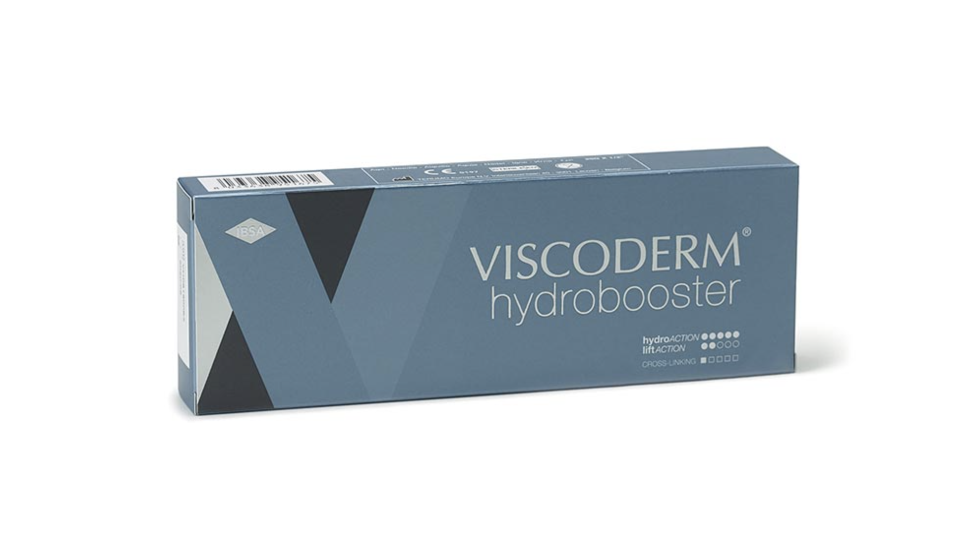 Viscoderm Hydrobooster is a re-absorbable medical device (sterile, pyrogen-free and physiological gel) used to restore intradermal hydration and to help improve the structure and elasticity of the skin. The main ingredient is cross-linked hyaluronic acid, which is not of animal origin, produced by bacterial fermentation.